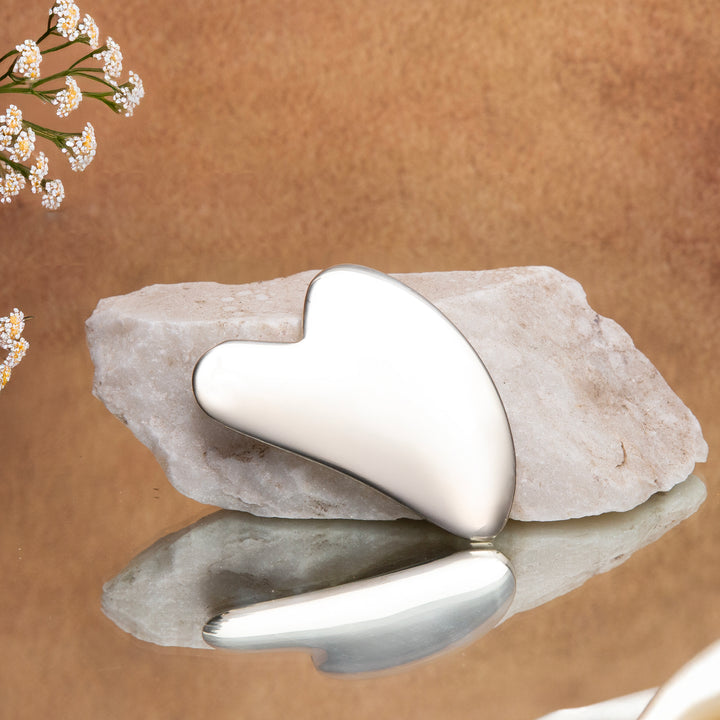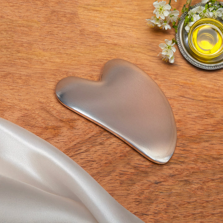 Kansa Guasha for the face is an Ayurvedic facial massage technique using a small, rounded tool made from Kansa metal. This practice involves gentle, sweeping strokes across the face to stimulate blood circulation, promote lymphatic drainage, reduce puffiness, and relax facial muscles. It helps improve skin tone, texture, and elasticity while encouraging the absorption of skincare products. Regular use of Kansa Guasha can lead to a glowing, more youthful complexion and a balanced, rejuvenated appearance.